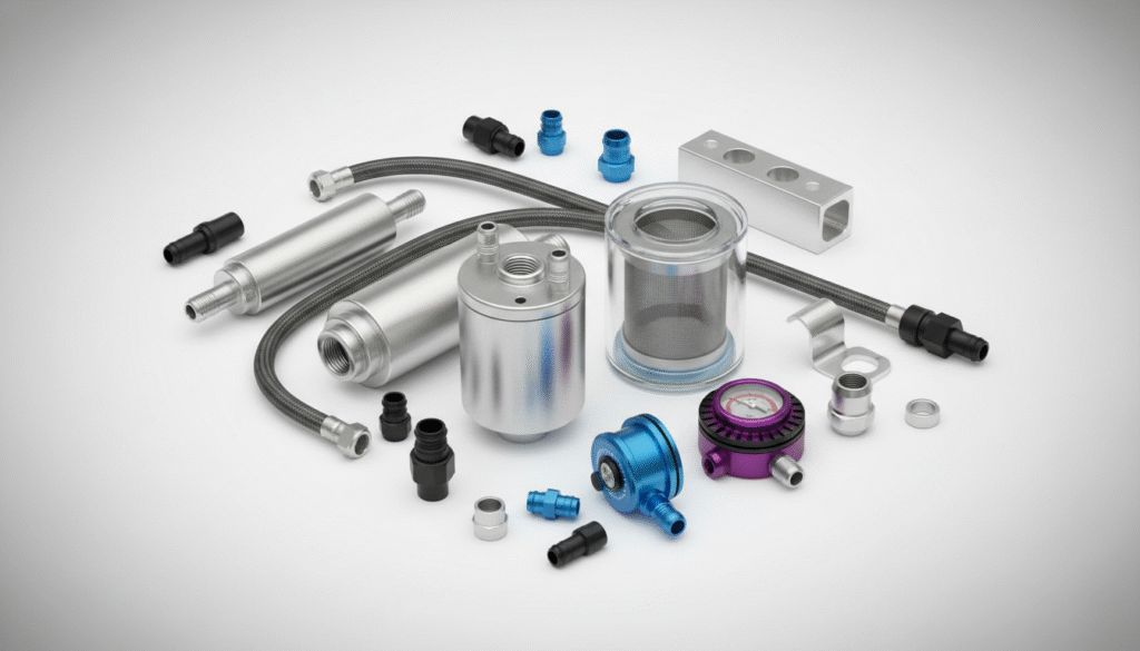 Fuel Filters cover inline and canister styles, in-tank pump filters, and swirl-pot water separators that shield modern fuel systems from particulates, varnish, and water. They serve petrol, diesel, and ethanol blends up to E85, with filtration commonly in the 8-20 micron range and high-flow performance for motorsport and high-horsepower street cars. Variations include inline filters with 8 mm, 12 mm and 14 mm ports, steel or alloy canisters, and replaceable elements, plus water-separation units in swirl pots for added protection. These filters integrate with EFI layouts and performance regulators to maintain clean fuel delivery.